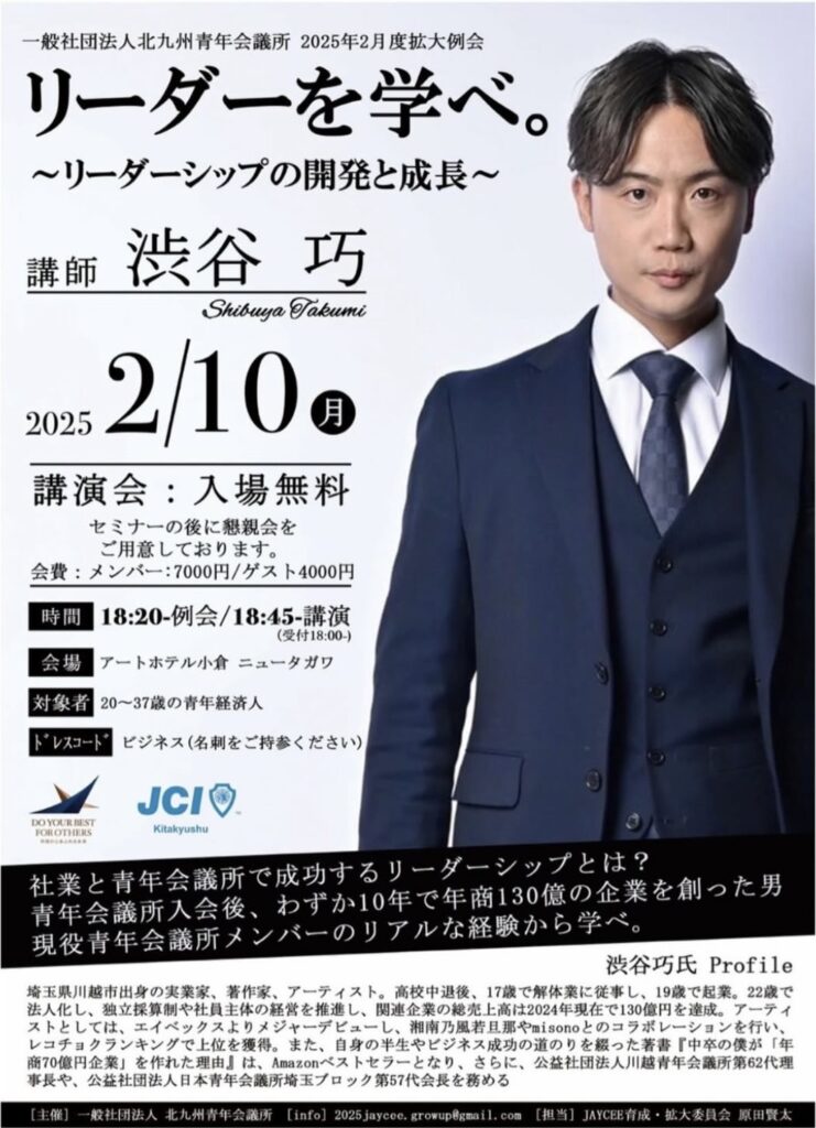 例会中には、社業とJCを両立し、わずか10年で年商130億円の企業を創り上げた、渋谷巧氏を講師にお招きし、「リーダー」を学べ。~リーダーシップの開発と成長~と題した講演をおこないます。