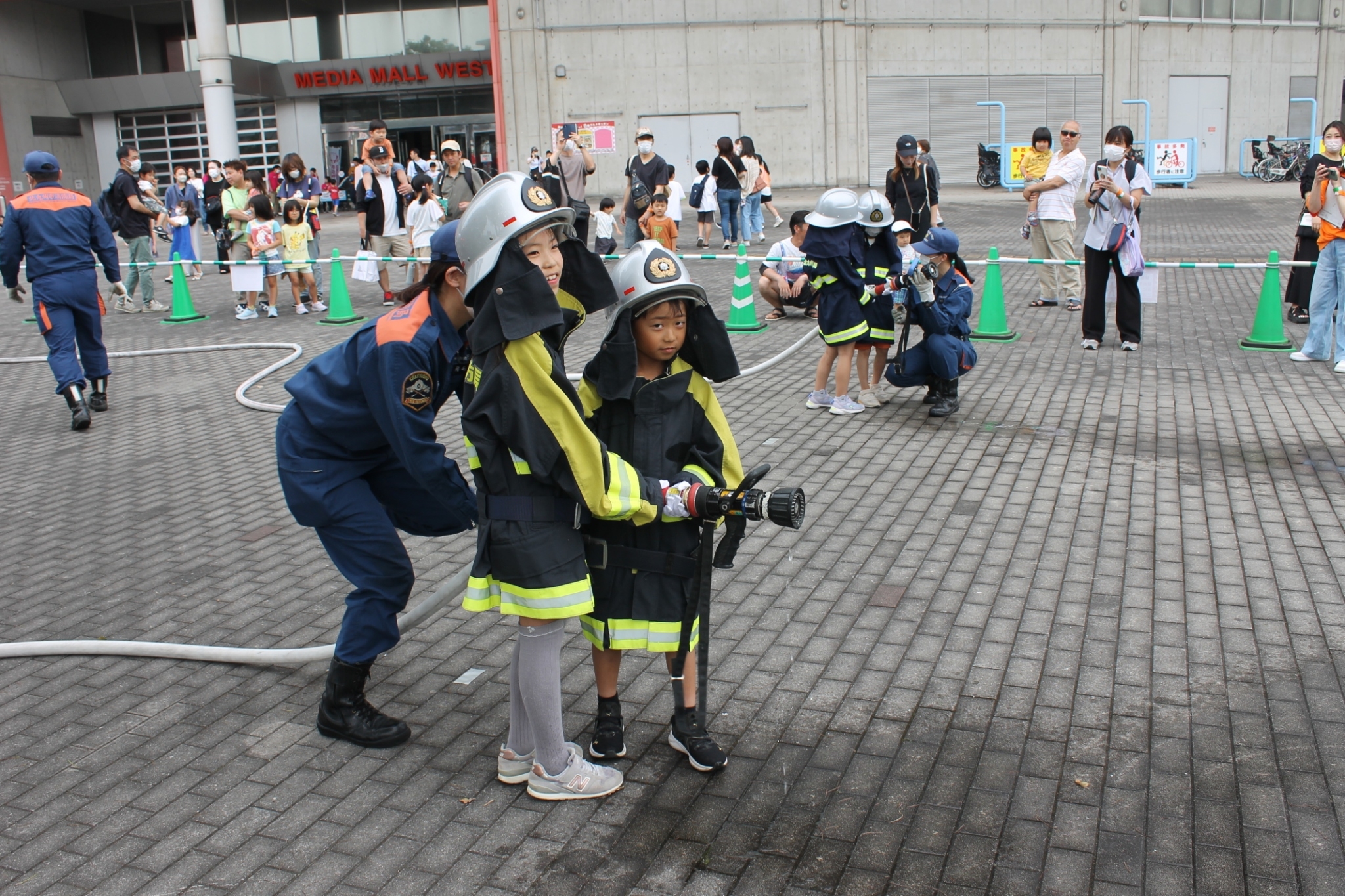 消防士の1日の仕事内容や日々の訓練内容、器具のチェック等について学び、実際の消火ホースを使用し消火作業の体験をおこないました。