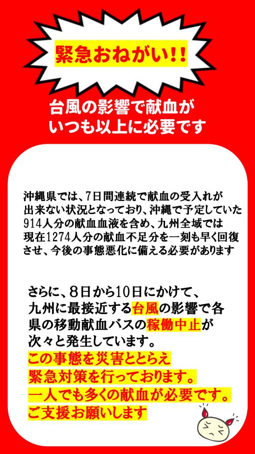 沖縄県では7日連続で献血受入ができておらず、九州全域でも献血血液が不足しております。