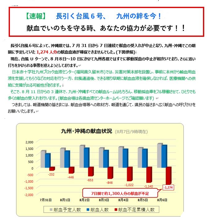 沖縄県では7日連続で献血受入ができておらず、九州全域でも献血血液が不足しております。