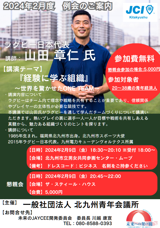 2⽉度例会のご案内です。講師に元ラグビー⽇本代表の⼭⽥章仁⽒を招き、「経験に学ぶ組織〜世界を驚かせたONE TEAM」をテーマに講演していただきます。多くのご参加をお待ちしております。