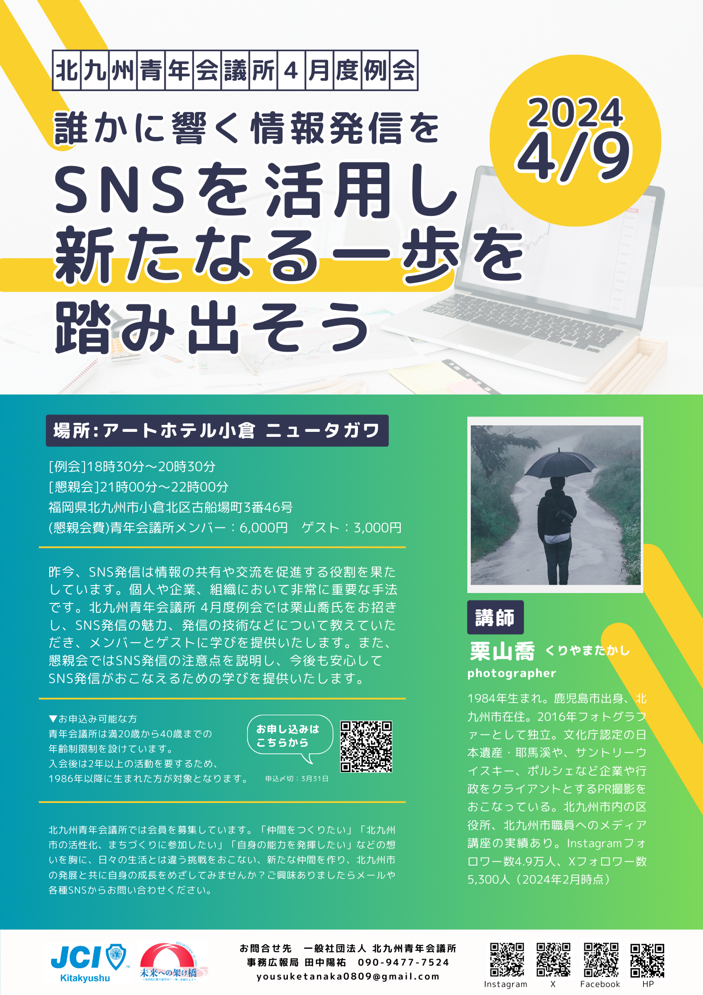 4⽉度広報例会のご案内です。講師にフォトグラファー栗山喬⽒を招き、「誰かに響く情報発信を〜SNSを活用し新たなる一歩を踏み出そう」をテーマに講演していただきます。SNS発信の魅力、発信の技術などについて学ぶ機会となっています。多くのご参加をお待ちしております。