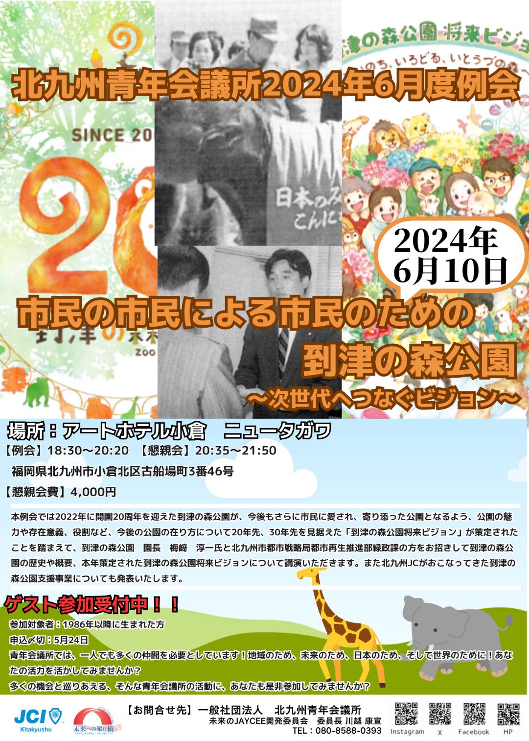 6月度例会のご案内です。講師に北九州市緑政課と到津の森公園園長梅﨑氏をお呼びし、「市民の市民による市民のための到津の森公園~次世代へつなぐビジョン」をテーマに講演していただきます。多くのご参加をお待ちしております。