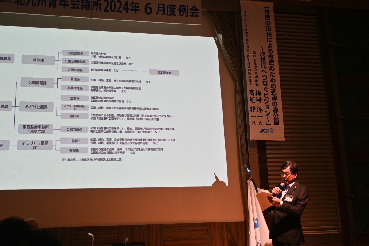 講演前には、未来のJAYCEE開発委員会のメンバーより到津の森公園と北九州青年会議所の繋がりの歴史についてスライドを用いた発表がありました。
