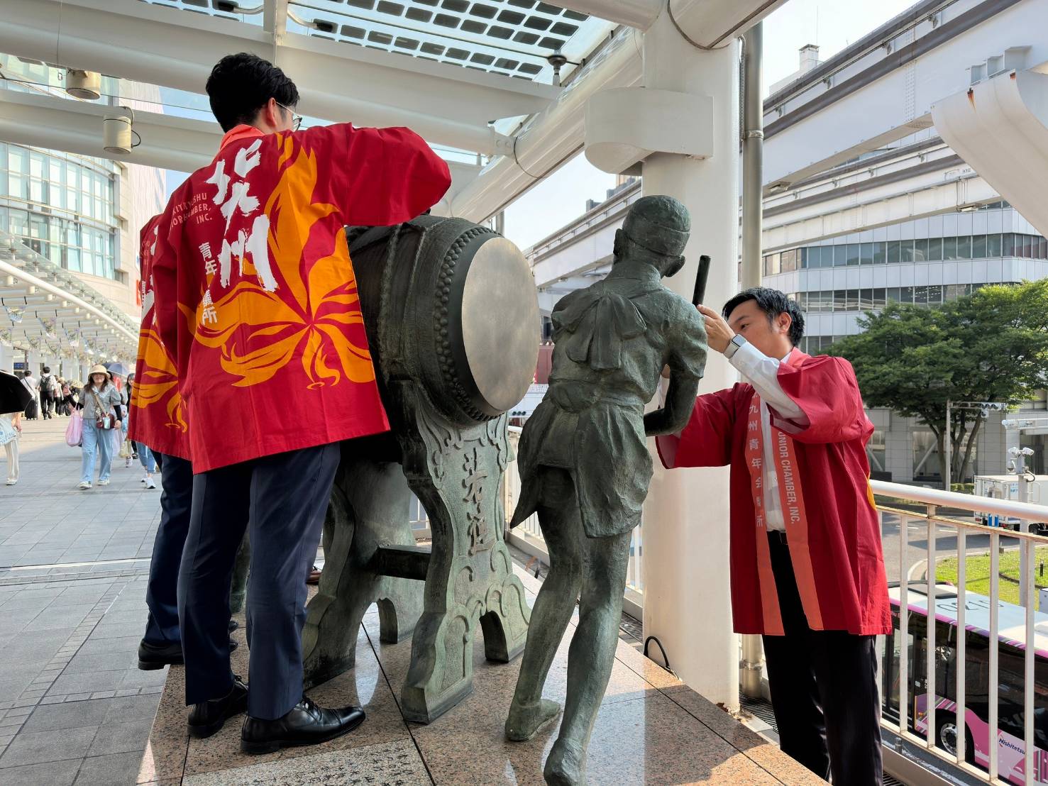 7月12日(金)に小倉駅南口ペデストリアンデッキに設置されている小倉祇園太鼓像の清掃をおこないました。