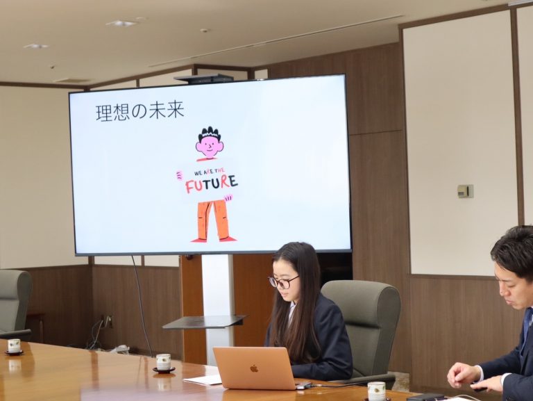 矢野さんから、知事・副市長にむけて、「今回の研修で、貧困がない世界、戦争や武器がない世界、偏⾒がない世界、みんなが⽣きる理由を感じる環境があることがわかり、このような世界を作るためには、国々で話し合い、問題を⾒つけ、それを解決するようにする、さまざまな⾔語を学び、他者を尊重していきたい」と力強い報告をしていただけました。